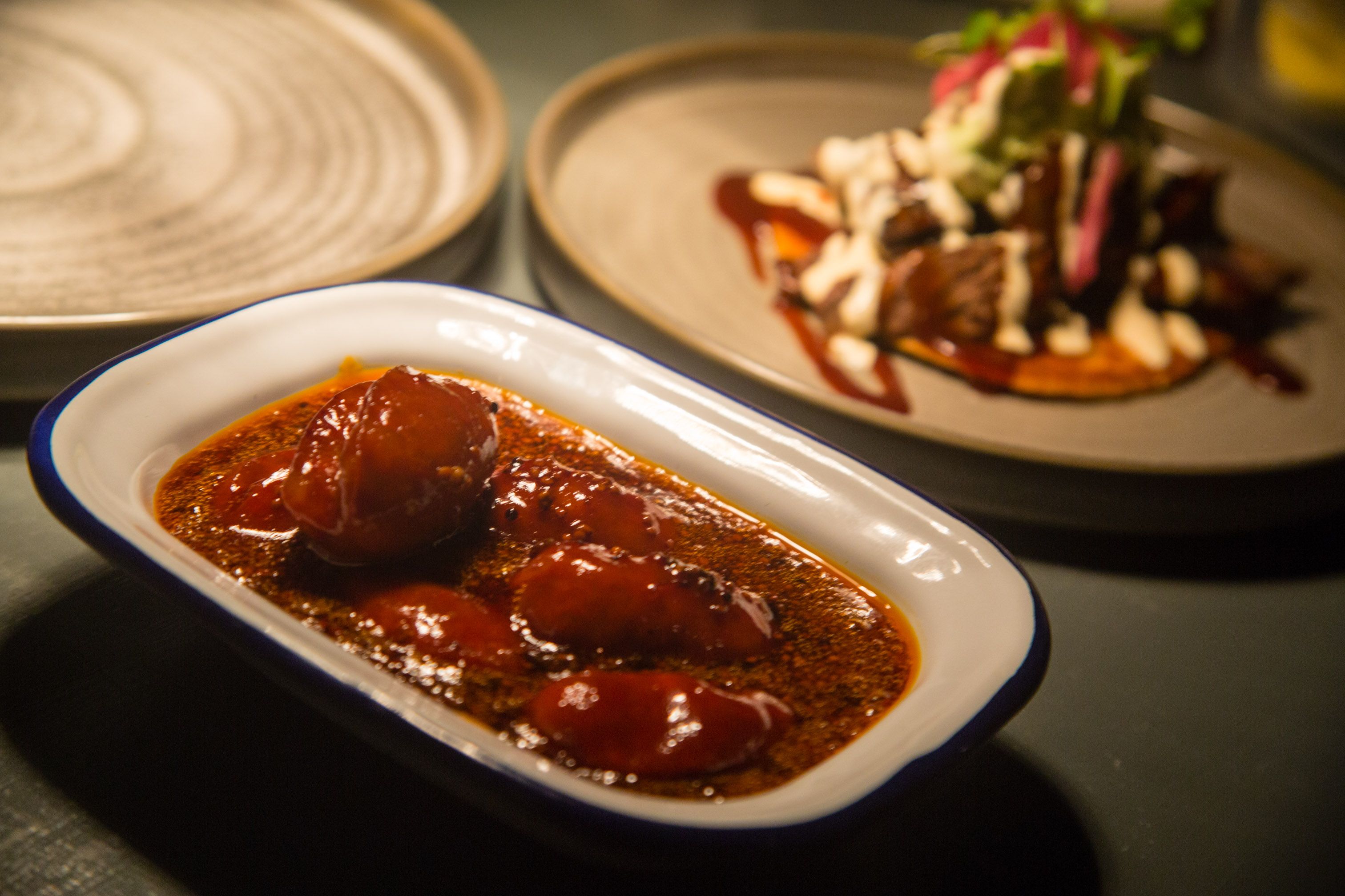 Spanish dry aged pork burger made from Spanish pigs fed on chestnuts, cherrywood smoked garlic glazed carnitas, melted Gouda cheese, Carolina gold barbecue sauce, toasted potato bun.
