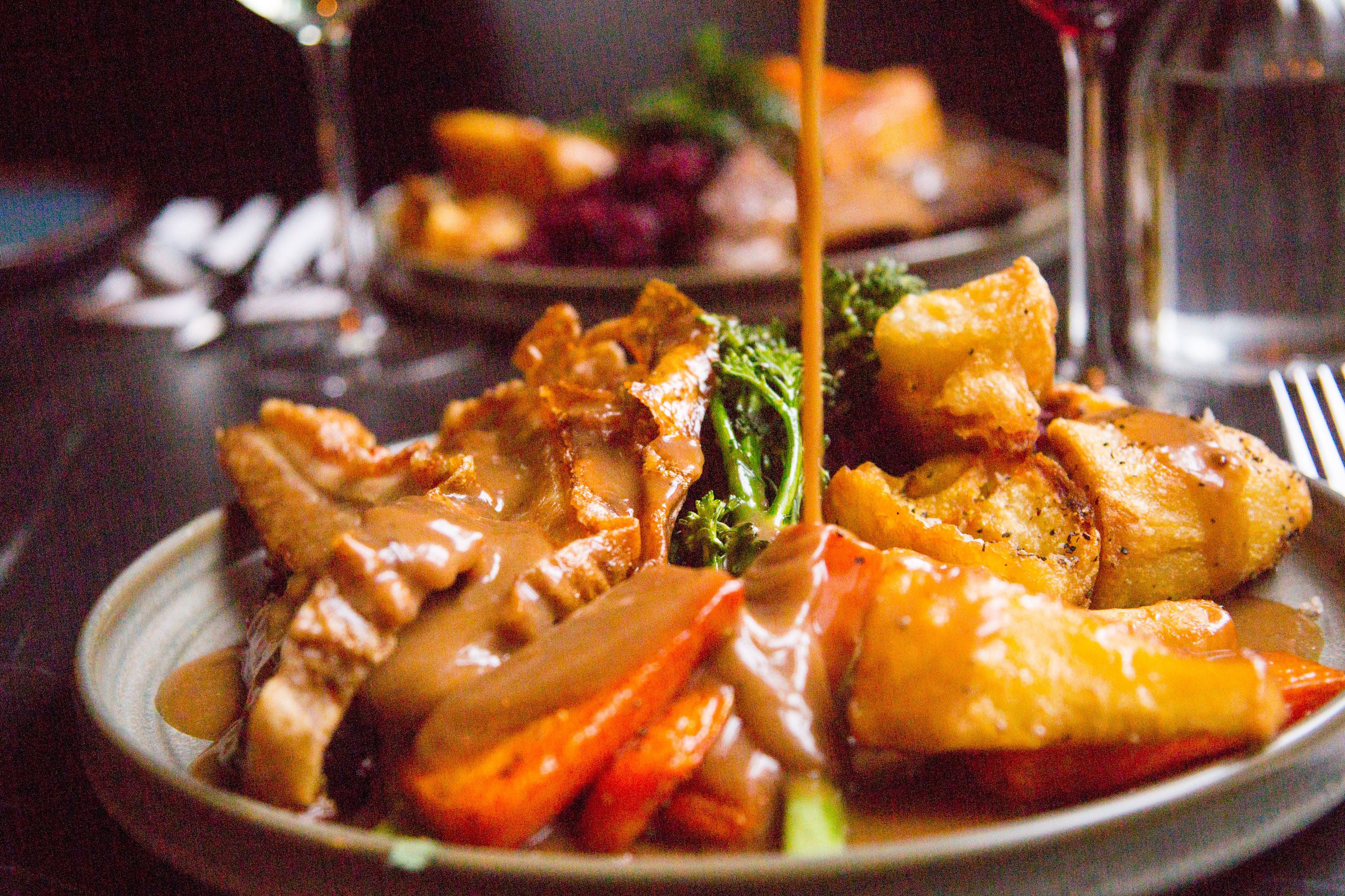 All roasts are served with goose fat roasties, ultimate mash, honey glazed root vegetables, braised red cabbage, greens and I.P.A onion gravy.